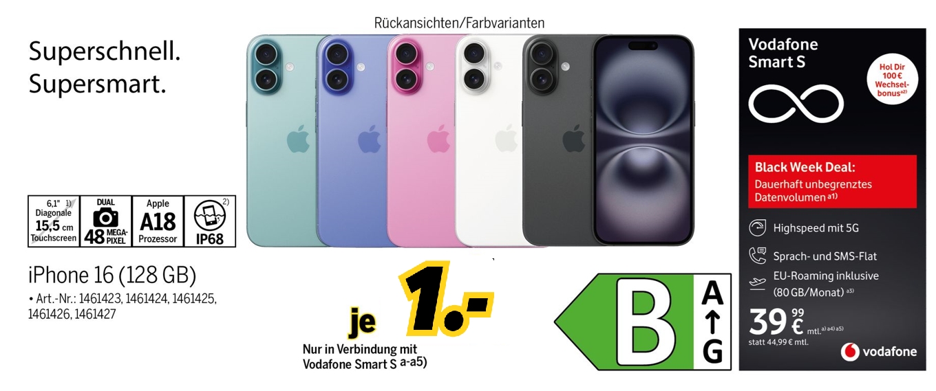 a1) Bei Neuabschluss eines Mobilfunkvertrags oder einer Vertragsverlängerung in den Tarifen Smart 2022 Lite-XXL bekommst du unbegrenztes Datenvolumen fürs Surfen im deutschen Vodafone-Netz. Das zusätzliche Datenvolumen entfällt, wenn Du kündigst oder den Tarif wechselst. Bei einem Tarif mit unbegrenztem Datenvolumen kannst Du mit jeder Red+ Karte maximal bis zu 10 GB zuteilen. Fürs Surfen im EU-Ausland bekommst Du für den Smart S 80 GB.