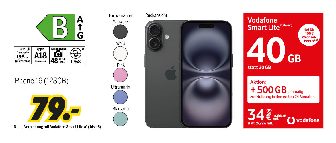 a1) Aktion Stand Dezember 2025: mtl. Paketpreis 39,99 €. Mindestlaufzeit 24 Monate. Einmaliger Anschlusspreis 39,99 €. Du hast eine Flat für Standard-Gespräche in dt. Netze und eine SMS-Flat in dt. Mobilfunknetze. Sondernummern sind ausgeschlossen. Du surfst bis zu einem Datenvolumen von 40 GB/Mon. (statt 20 GB/Mon.) mit der jeweils größtmöglichen Bandbreite mit Vodafone. Bei Abschluss eines Smart Lite-Tarifes profitierst du kostenfrei und dauerhaft im Inland von der neuen 5G-Netz-Technologie. Um das 5G-Netz nutzen zu können, brauchst Du ein 5G-fähiges Gerät.